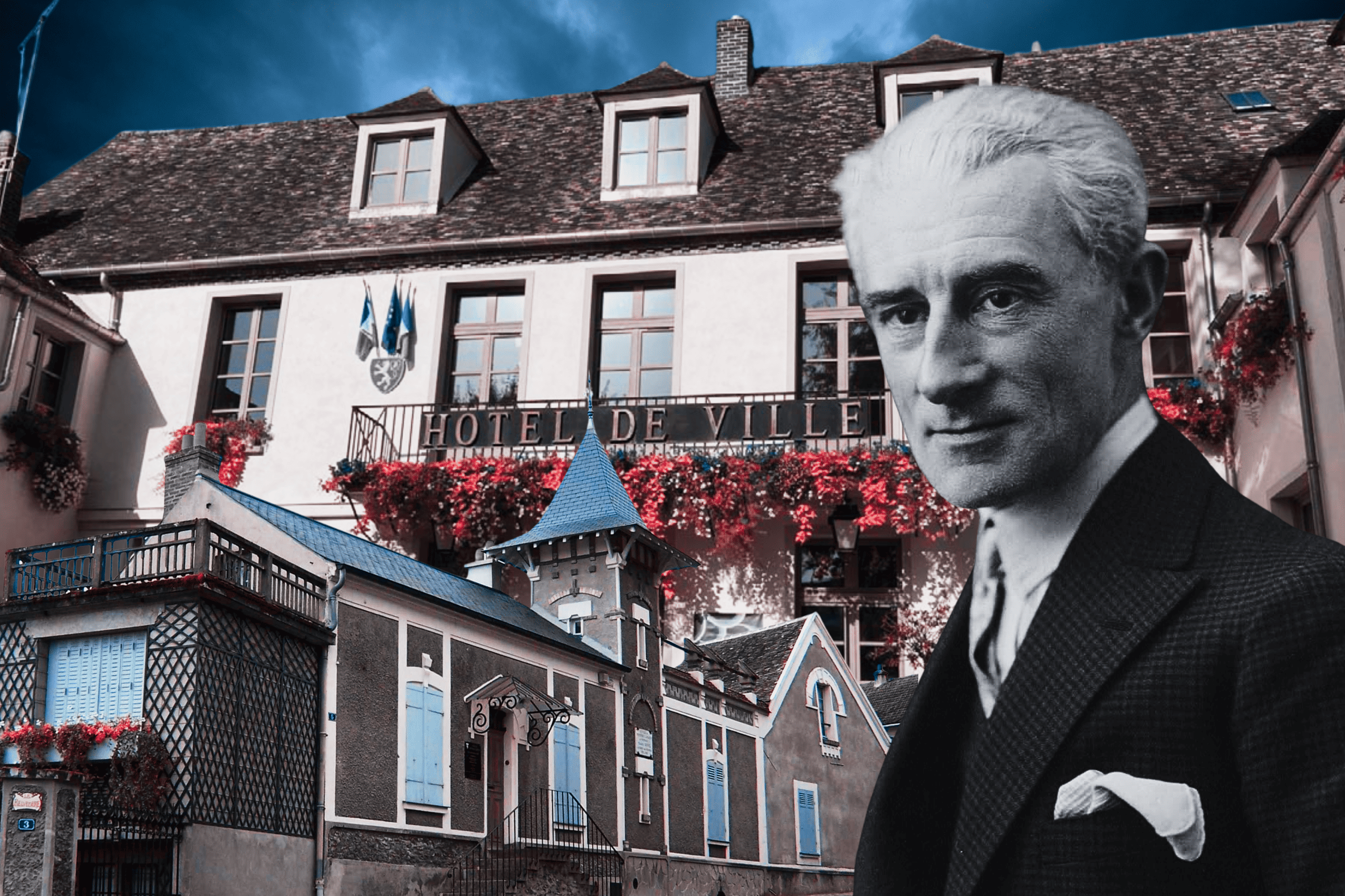 La mairie de Montfort-l'Amaury, le Belvédère et Maurice Ravel © Photomontage Jade Bourgery