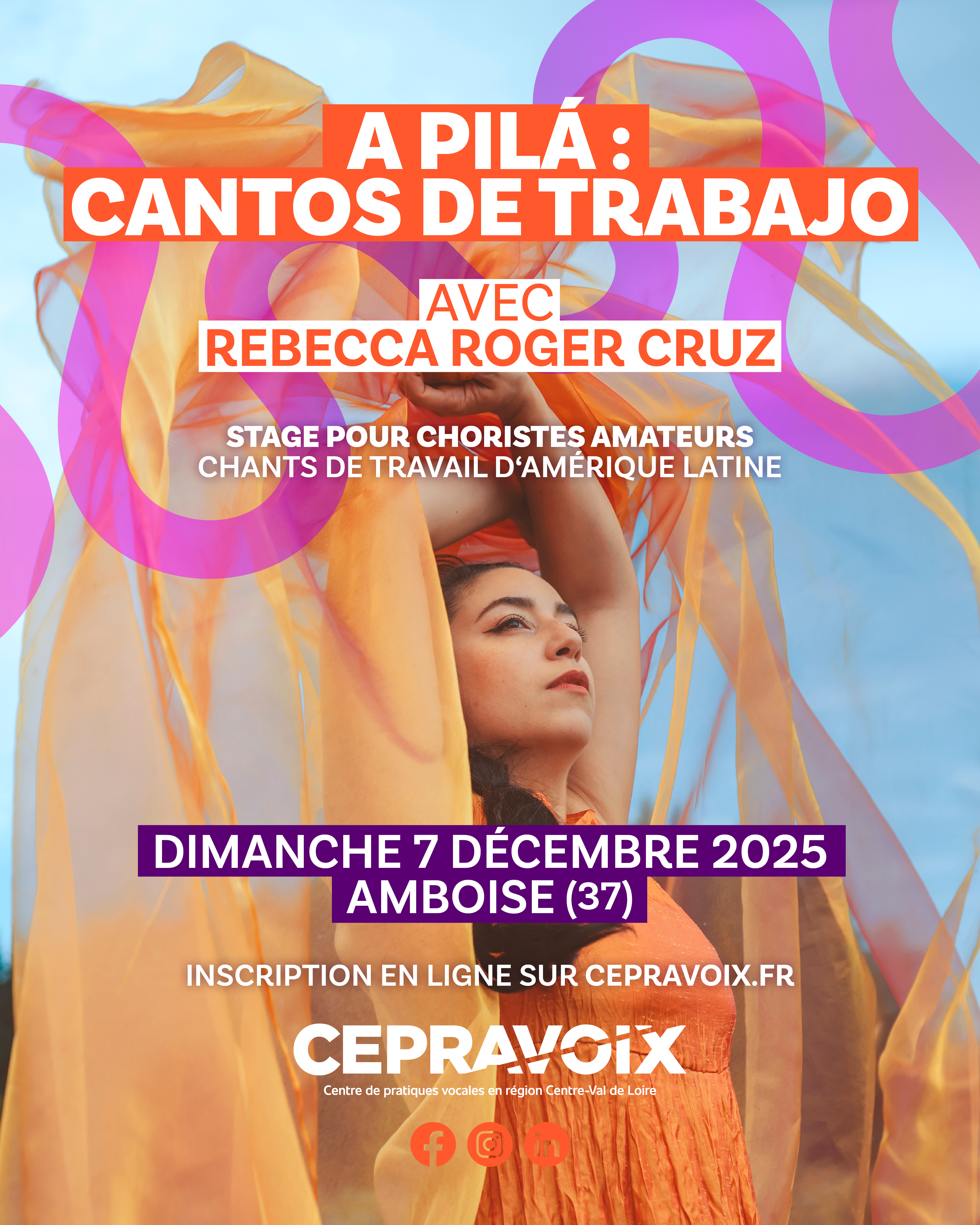 Stage pour choriste pratiquant ou ayant déjà pratiqué le chant polyphonique traditionnel Vous avez été conquis·e par son énergie durant l’incroyable concert d‘ouverture du 20e Festival de la Voix de Châteauroux, avec son ensemble de feu : Parranda La Cruz ? Découvrez l’univers inspirant de Rebecca Roger Cruz. Ses chants tissent un lien profond entre la voix humaine, la nature et les rites du vivant. Dans cet atelier, elle vous guidera à travers un répertoire de chants de travail traditionnels d’Amérique Latine. Chansons pour piler le maïs, chants de lavandier·ère·s, berceuses, tonadas, recettes de cuisine, chansons d‘amour et des invocations à la nature... Les chants de travail constituent un répertoire souvent rythmé, car le chant accompagnait la tâche à faire. Dans ce stage, les percussions fusionnent avec le chant et des mouvements de danse. Vous aurez l‘opportunité de vous accompagner avec des percussions diverses : percussions corporelles, quitiplás (bambous pilonnés), maracas… Intervenante : Rebecca Roger Cruz, chanteuse, artiste lyrique et musicologue vénézuélienne Inscription : https://my.weezevent.com/a-pila-cantos-de-trabajo Date et lieu : Dimanche 7 décembre 2025 de 10h00 à 17h00 à Amboise (37) Tarif : 90€ Tarif réduit pour tous (early bird) de 70€ pour une inscription jusqu’au 9 novembre 2025 Tarif étudiant·e·s : 20€ (élèves de l'enseignement supérieur inscrit·e·s à la rentrée 2025, et de moins de 25 ans). Adhésion individuelle 2025 au Cepravoix indispensable : 10€ Pré-requis : aucun