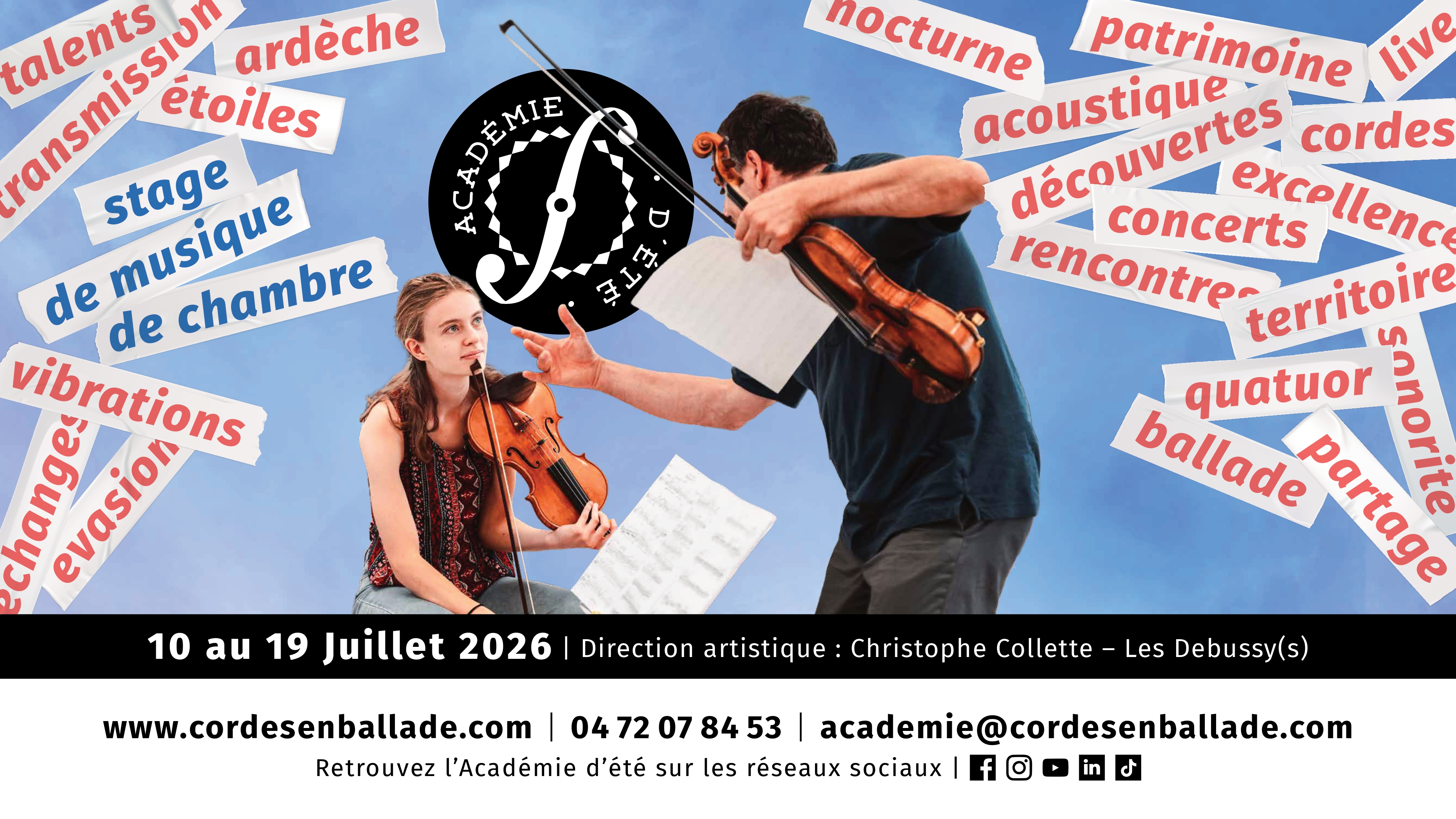 L’Académie d’été, dirigée par les musiciens des Debussy(s), accompagne les musiciens et musiciennes souhaitant découvrir la musique de chambre ou progresser dans leur ensemble en vue d’une pratique professionnelle. Pendant 10 jours de stage, les chambristes seront formés par les musiciens des Debussy(s) ainsi que des artistes invités du Festival, à travers des cours quotidiens, des masterclasses, des rencontres, des répétitions, etc.. Tout au long du stage, une équipe d’animation pédagogique accompagnera également les stagiaires en leur proposant des activités culturelles et les emmenant assister aux concerts du Festival. Le stage se clôturera par deux restitutions publiques de l’Académie gratuites et ouvertes au public. L’ensemble scolaire Marie-Rivier à Bourg-Saint-Andéol est le lieu d’accueil de cette formation unique en France, permettant une immersion au cœur du Festival dans des conditions idéales (hébergement, restauration collective, foyer, partothèque, espaces de travail et de convivialité…). Qui peut y participer ? Tous les instruments sont les bienvenus à partir du cycle 2. En individuel ou en formation déjà constituée (trio, quatuor, quintette), les groupes peuvent être adaptés selon l’âge, le niveau ou les envies de chaque instrumentiste. La constitution de quatuors déjà formés souhaitant perfectionner leur technique sera étudiée par les Debussy(s) dans le but de former un groupe aussi cohérent que possible. Il reste encore des places ! Les inscriptions sont ouvertes jusqu’au 31 mai 2026 ! Retrouvez toutes les modalités d’inscriptions et le formulaire à remplir sur notre site : https://www.cordesenballade.com/lacademie-dete/ Des questions ou besoin d’informations supplémentaires ? Contactez-nous à l’adresse academie@cordesenballade.com