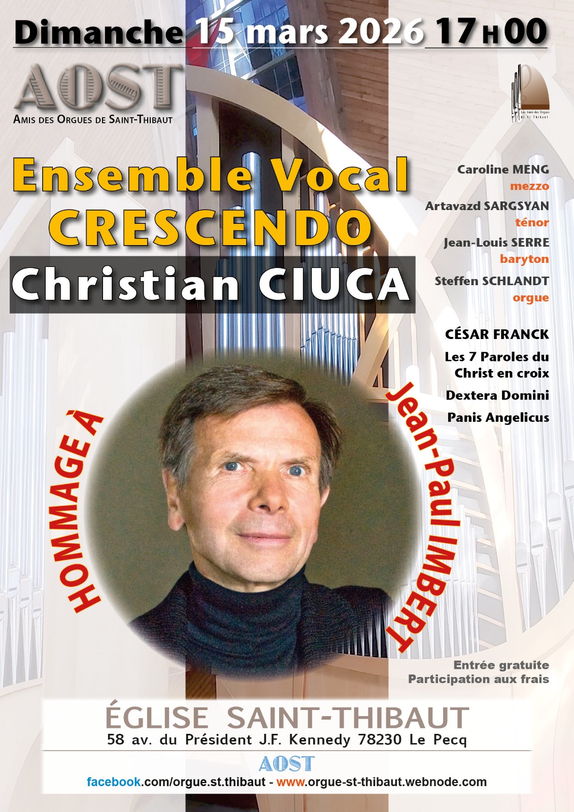 🎶 Concert ensemble vocal et orgue Dimanche 15 mars 2026 – 17h 📍 Église Saint-Thibaut – Le Pecq 78230 CÉSAR FRANCK Les 7 Paroles du Christ en croix Dextera Domini Panis Angelicus Ensemble vocal CRESCENDO Direction : Christian Ciuca 🎤 Caroline Meng, mezzo 🎤 Artavazd Sargsyan, ténor 🎤 Jean-Louis Serre, baryton 🎹 Steffen Schlandt, orgue ✨ Concert hommage à Jean-Paul Imbert, disparu en septembre 2025, après 43 années d’enseignement fidèle et passionné. Pendant plus de quatre décennies, il a formé des générations d’organistes, transmis l’amour du répertoire, l’exigence du style et le respect de l’instrument. Son engagement aura profondément marqué le monde musical de l'orgue au plan international. 🎟️ Libre participation aux frais Organisé par AOST – Amis des Orgues de Saint-Thibaut 🌐 https://fb.me/e/5AYyX5wHB 🌐 https://orgue-st-thibaut.webnode.fr/