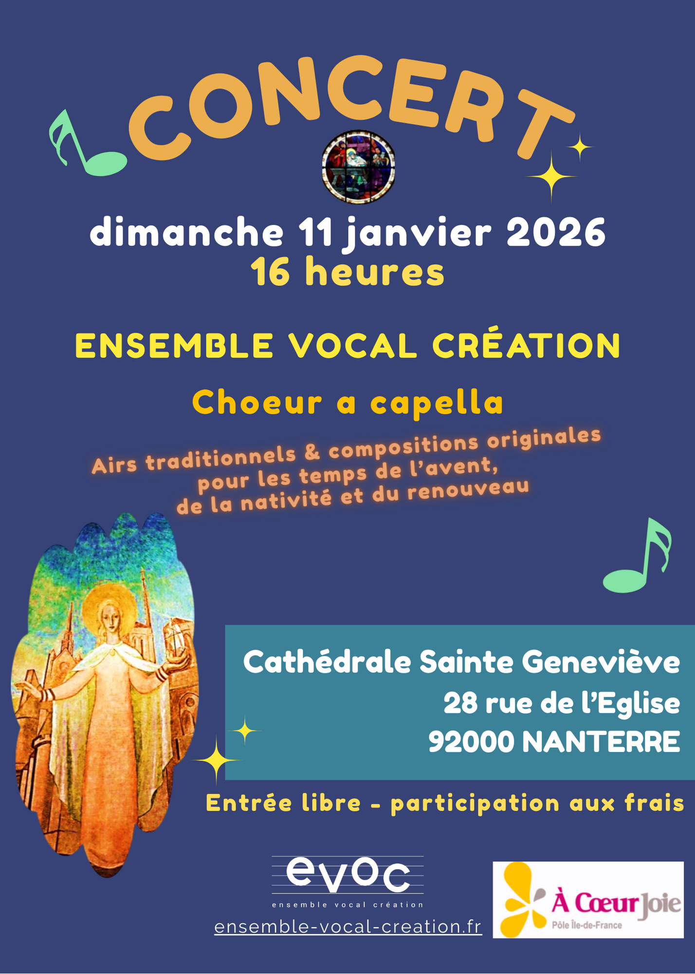 Retrouvez l’EVOC pour un concert du Renouveau exceptionnel, le dimanche 11 janvier 2026 à 16h à la Cathédrale Sainte Geneviève de Nanterre (92000). Appréciés pour sa qualité vocale remarquable et l’originalité de son répertoire, l’EVOC (Ensemble Vocal Création) vient pour illuminer votre période de l’Avent et de la Nouvelle Année. Laissez-vous transporter par un programme entièrement a cappella qui explore toutes les facettes de la fête, à travers les styles et les époques. Du traditionnel Jingle Bells aux nouvelles compositions en avant-première, en passant par des incontournables de la pop : il y en a pour tous les goûts ! Imaginez le vent jouant dans les sapins enneigés se mêler aux trompettes joyeuses des anges divins… Un moment d’évasion musicale et spirituelle !