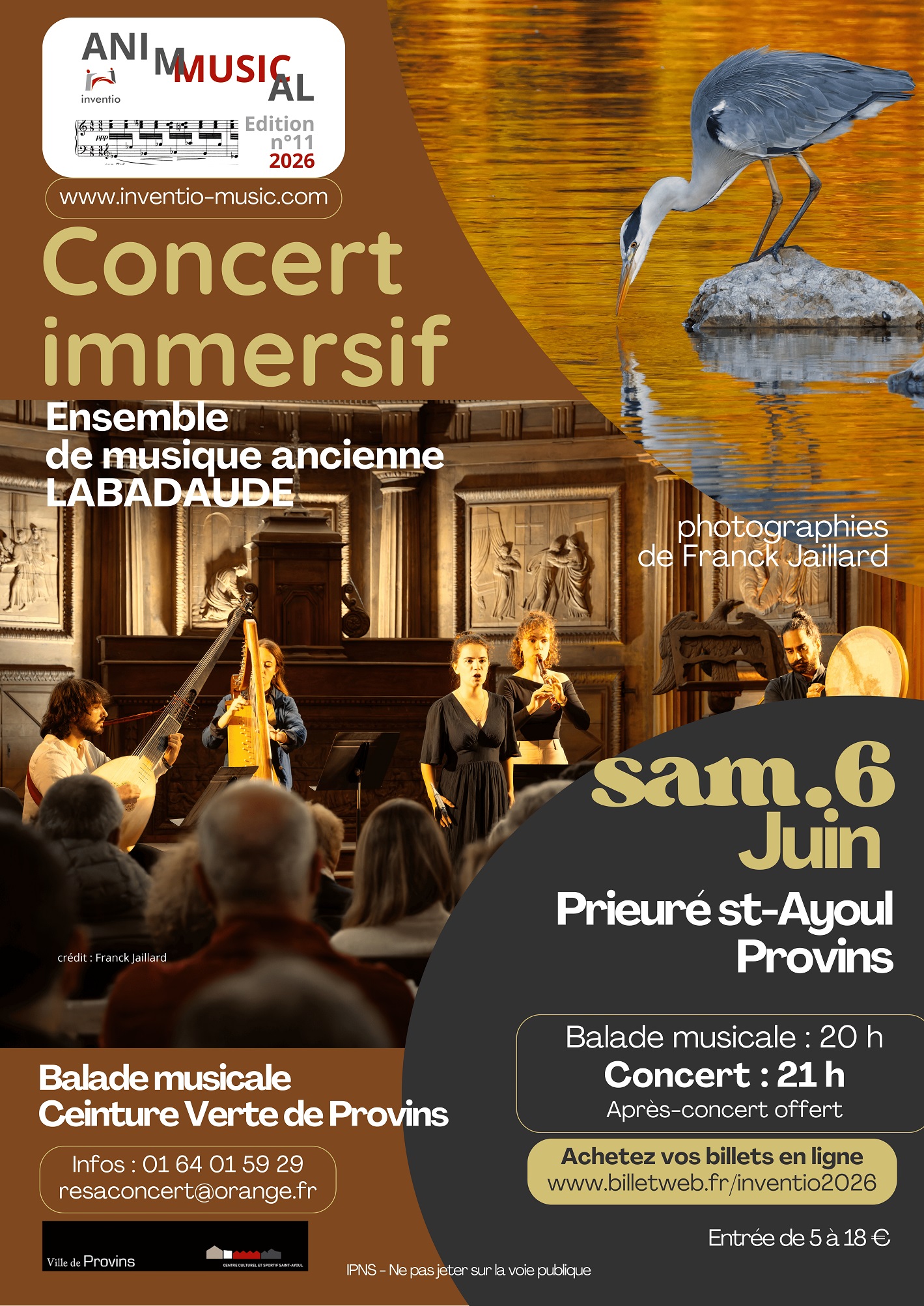 En famille ! Bucolique et patrimonial Plongez dans une expérience sensorielle unique où la musique et l’image se répondent avec poésie au cœur du site millénaire du Prieuré Saint-Ayoul. L’ensemble baroque LABADAUDE vous propose un voyage musical autour du rossignol, figure emblématique du Moyen Âge. Symbole de la courtoisie, de l’amour idéalisé et du chant inspiré des troubadours, l’oiseau devient le fil conducteur d’un programme mêlant pièces instrumentales et vocales du répertoire médiéval et baroque. Ses trilles et ornements trouvent un écho subtil dans les arabesques musicales, évoquant jardins, forêts et scènes galantes. En regard de la musique, une projection immersive de photographies de Franck Jaillard installe un véritable paysage vivant : oiseaux des sous-bois, clairières au crépuscule, détails fragiles du monde sauvage. Les images dialoguent avec les timbres anciens —voix, clavecin, théorbe, guitare, harpe, flûte, violone—. • En prélude (option sur inscription) : Marche douce au rythme de la nature ponctuée d’escales musicales intimistes le long des Promenades Provinoises. • Le concert immersif dans le Prieuré propose un parcours au cœur de l’esthétique de l’air de cour. Inspiré par la thématique du rossignol, figure récurrente de la poésie amoureuse, le concert explore les différents états de l’âme amoureuse : attente, souffrance, plainte, résignation. Les œuvres choisies témoignent de la richesse expressive du répertoire, alternant airs sérieux, pièces à caractère plus léger et œuvres instrumentales, dans un esprit proche de celui des concerts privés du XVIIᵉ siècle. Doux Rossignol, c’est à travers le dialogue entre un rossignol et une amante désespérée que Labadaude emmène le public dans une épopée lyrique explorant les mœurs et les codes d’un des cercles lettrés privilégiés de la France du XVIIe siècle. • Après-concert gourmand offert partagé avec les artistes dans la cour du Prieuré
