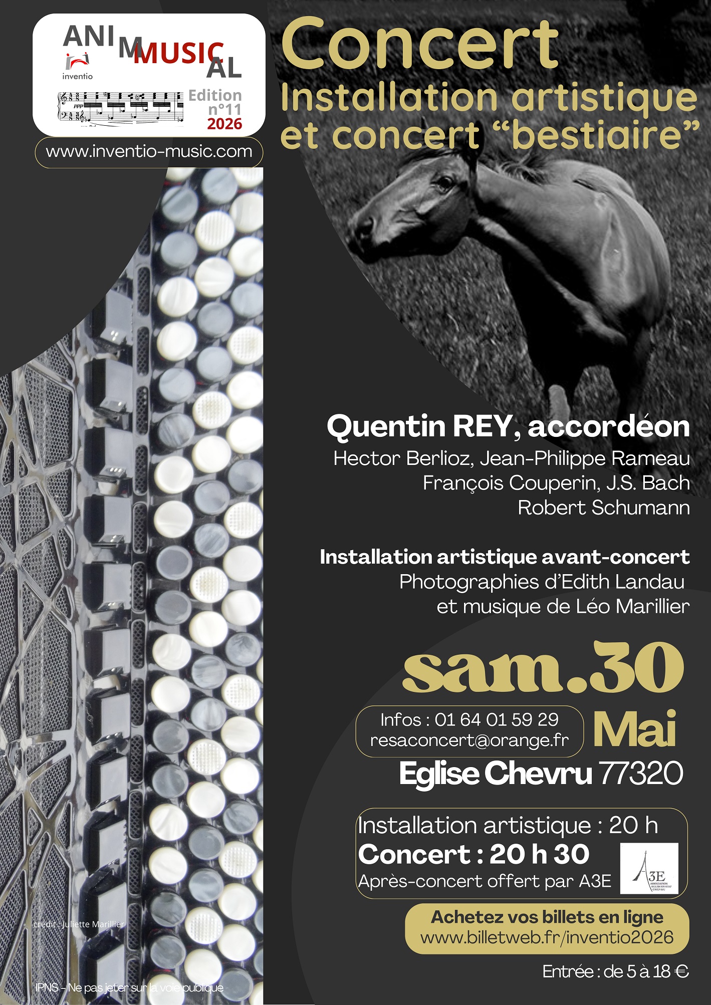 Loin des clichés, l’accordéon se fait dans cet événement, tantôt orchestral, délicat, puissant et méditatif. L’accordéon est caméléon : il se faufile, trouve sa place en chaque voix de la nature. On croit pouvoir classer l’accordéon, l’affubler d’une identité souvent proche du rustique, du quotidien, mais il nous échappe toujours, parvient à se renouveler dans tous les répertoires, et parvient à renouveler les répertoires eux-mêmes. L'accordéon est peut-être l’instrument qui mêle le plus les tons, de l’étrange au réconfortant. Par sa capacité d’imiter la qualité des autres instruments, à travers un répertoire incluant des pièces champêtres de Rameau et Couperin, un mouvement de la symphonie fantastique de Berlioz, nous allons de l’archaïque au raffiné. L’accordéon est caméléon: il se faufile, trouve sa place en chaque voix de la nature. Il siffle, caquète, hurle, gronde. Ce programme est pétri par l'énergie, la force et le souffle du monde animal. En complètement, une exposition d’œuvres photographiques d'Edith Landau, qui elles aussi explorent la sève la plus profonde de la nature. Au programme : • En avant-concert, immergez-vous dans l’installation inédite où la musique de Léo Marillier dialogue avec une projection de photographies animalières d’Edith Landau : regards sauvages, envolées d’oiseaux, silences de la forêt, puissance des mammifères… Chaque image de la faune entre en résonance avec les nuances musicales, créant un voyage contemplatif au cœur du vivant. • Concert avec Quentin REY : On croit pouvoir classer l’accordéon, l’affubler d’une identité souvent proche du rustique, du quotidien, mais il nous échappe toujours, parvient à se renouveler dans tous les répertoires, et à renouveler les répertoires eux-mêmes. L'accordéon est peut-être l’instrument qui mêle le plus les tons, de l’étrange au réconfortant. Par sa capacité à imiter la qualité des autres instruments, à travers une palette incluant des pièces champêtres de Rameau et Couperin, un mouvement de la symphonie fantastique de Berlioz, nous allons de l’archaïque au raffiné. • Après-concert gourmand offert partagé avec les artistes