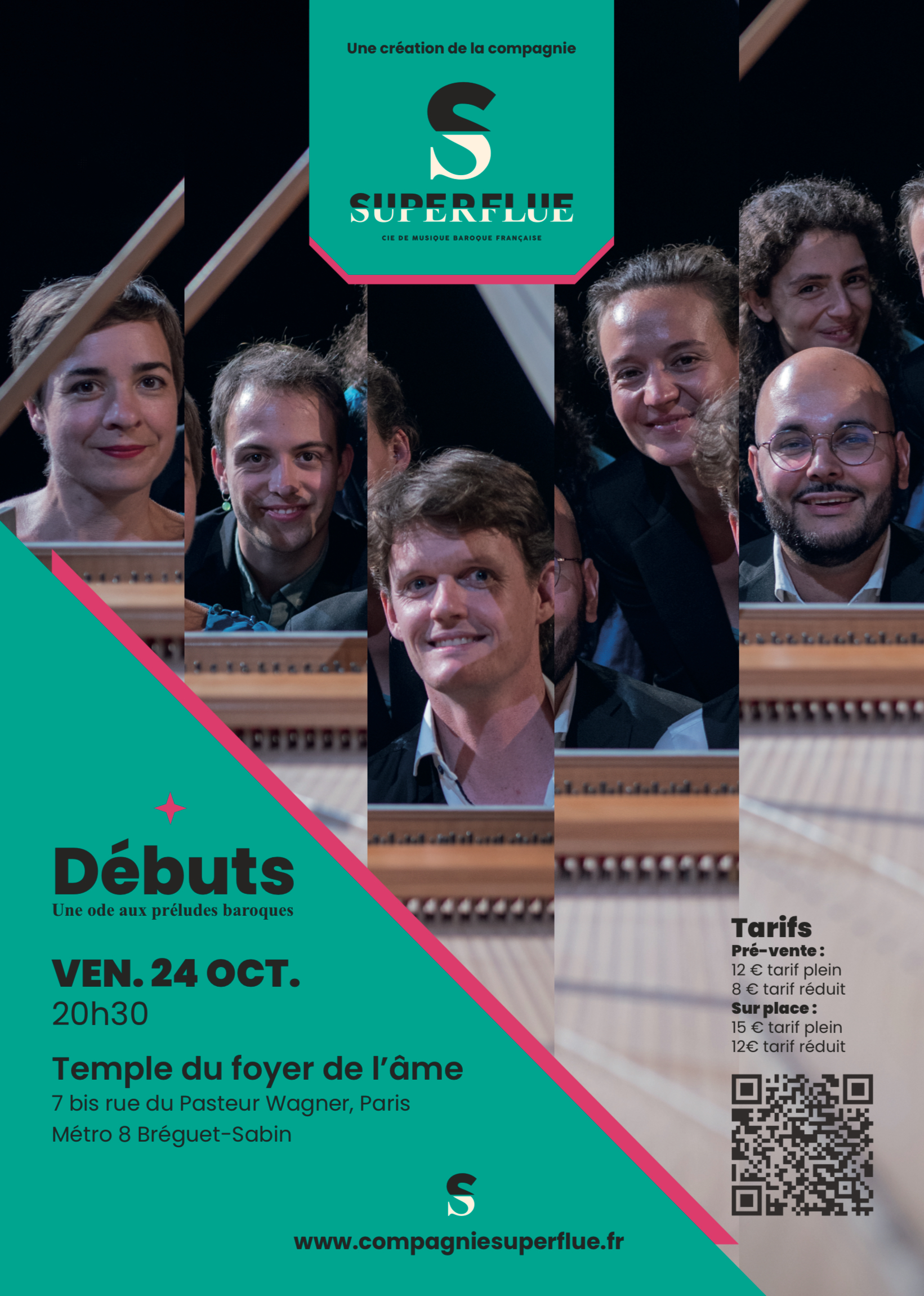 Pour fêter ses propres débuts, la Compagnie Superflue propose cette ode aux Préludes, aux Ouvertures, aux Entrées et à toutes les pièces introductives du répertoire baroque français. Ce concert est présenté dans une mise en espace afin d'amener le spectateur au plus proche de la matière sonore, dans une expérience immersive et une écoute renouvelée du répertoire du grand siècle. Vidéo de présentation: https://youtu.be/HsNdhRcHbP0?si=6dRDkIFjTpiJRyvz Christophe Mourault : violon Myriam Bulloz : violon / alto Clémence Bourgeois : traverso Marie Lerbret : flûte / basson Julie Dessaint : viole de gambe Pierre Boudeville : clavecin et direction Tarifs Pré-vente : 12 € tarif plein 8 € tarif réduit Sur place : 15 € tarif plein 12€ tarif réduit Voir moins