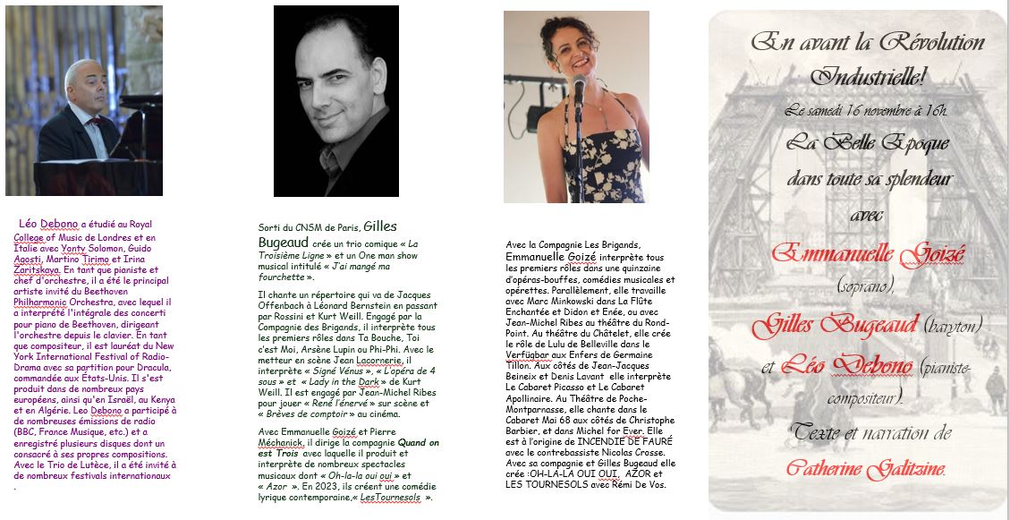 Au théatre des Sablons à Neuilly sur seine: Une lecture en musique de ces années insouciantes qu'on baptisa "la BELLE EPOQUE". Au programme, les bateaux de croisière, le train électrique, les malles Vuitton, les théâtres et les avenues éclairées à l'électricité, le téléphone, le télégraphe, le métro, les automobiles, l'avion.... sur des musiques d'Offenbach, de Messager, de Mireille, de Charles Trenet et d'autres. Interprétées par Emmanuelle Goizé (soprano), Gilles Bugeaud (baryton), Léo Debono au piano. Sur un texte de et lu par Catherine Galitzine Réservez vite vos places au 01 55 62 60 35 ou écrivez à billetterie@theatredessablons.com