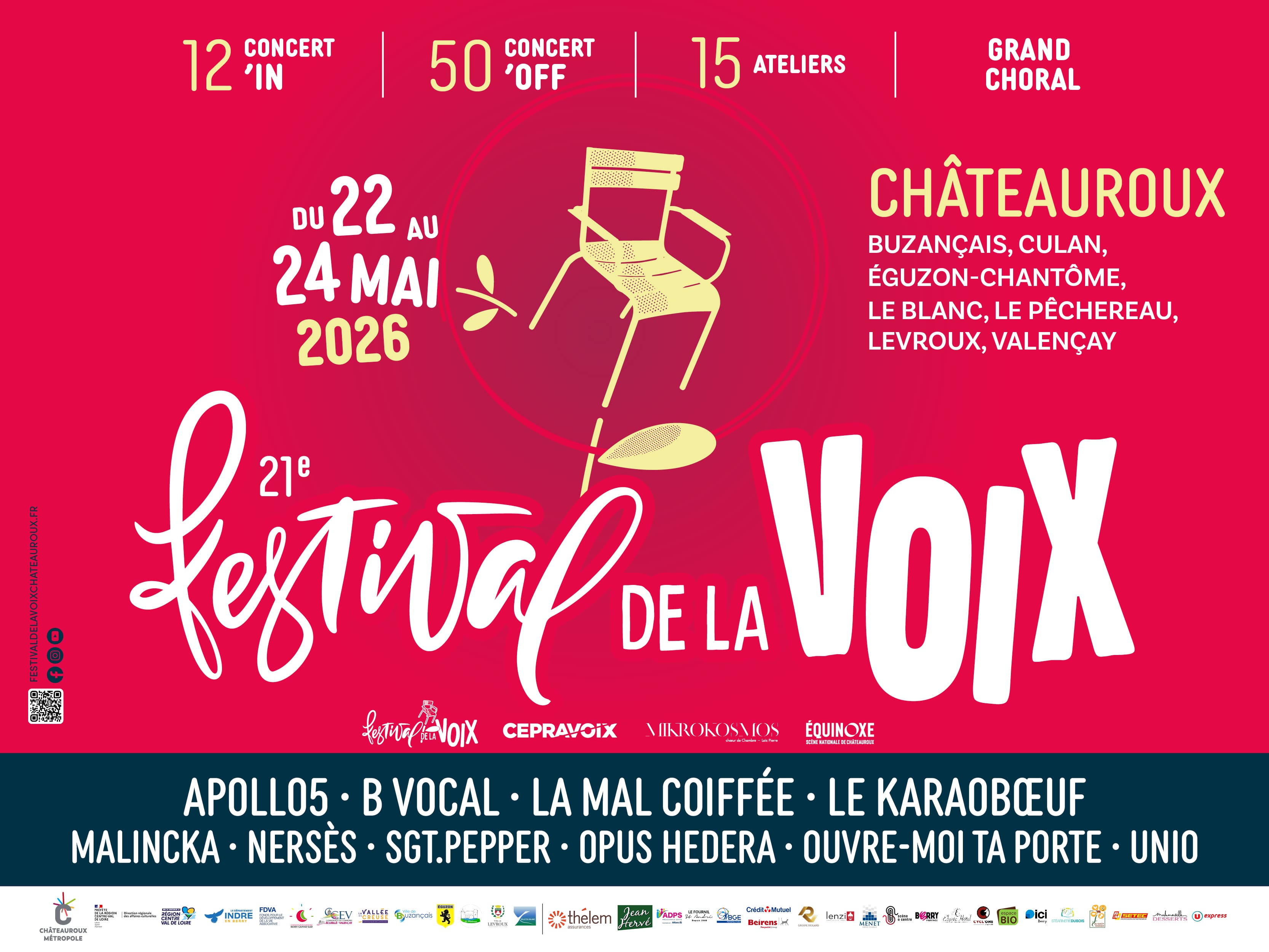 Du 22 au 24 mai 2026, le Festival de la Voix de Châteauroux, rendez-vous incontournable de l'art choral, célèbre la voix sous toutes ses formes ! Cette année, laissez-vous emporter par une programmation riche : • Des concert’IN avec en tête d'affiche la pureté du quintet londonien Apollo5, l'humour et la virtuosité du quintet espagnol B Vocal, et les polyphonies occitanes de La Mal Coiffée. • 50 concert’OFF, des concerts gratuits et sans réservation dans toute la ville, réunissant près de 700 choristes issus de 30 ensembles amateurs. • 15 ateliers vocaux et corporels, ainsi que des animations festives incontournables comme le Grand Choral, la balade chantée et le Karaobœuf ! Informations et billetterie en ligne sur le site internet.