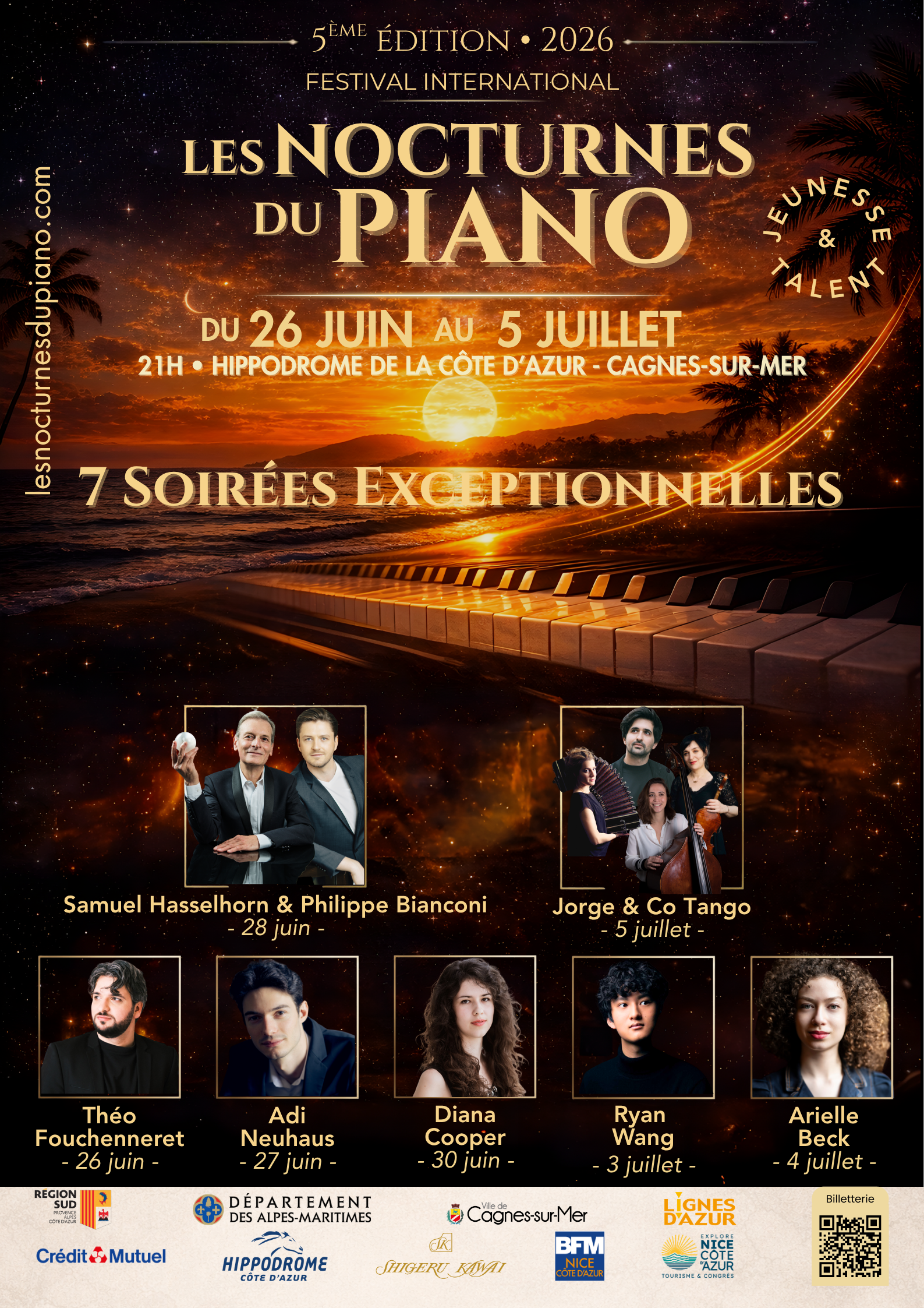 - Jorge Gonzalez Buajasuan (Piano) - Blanche Stromboni (Contrebasse) - Marion Chiron (Bandonéon) - Anne Le Pape (Violon) « Pour la soirée de clôture des cinq ans, il nous fallait un Feu d'artifice musical ! Trois merveilleuses femmes, trois merveilleuses musiciennes autour de Jorge, un jeune pianiste que nous adorons aux Nocturnes, et qui va nous dévoiler une autre de ses merveilleuses facettes ... Une soirée magique en perspective, RIEN QUE POUR VOUS ! » — Christine Gastaud Un ensemble de solistes d'exception pour une traversée de Buenos Aires à Paris. Autour de Jorge Gonzalez Buajasan, lauréat du prestigieux Concours Clara Haskil, l'ensemble propose un programme audacieux mêlant les classiques de Piazzolla à des compositions contemporaines. Programme : Entre Tango Nuevo de Piazzolla et Tango Traditionnel revisité ... Programme en détail : https://lesnocturnesdupiano.com/recitals/ Billetterie en ligne : https://www.billetweb.fr/pro/lesnocturnesdupiano2026 Programme en détail : https://lesnocturnesdupiano.com/recitals/ Billetterie en ligne : https://www.billetweb.fr/pro/lesnocturnesdupiano2026