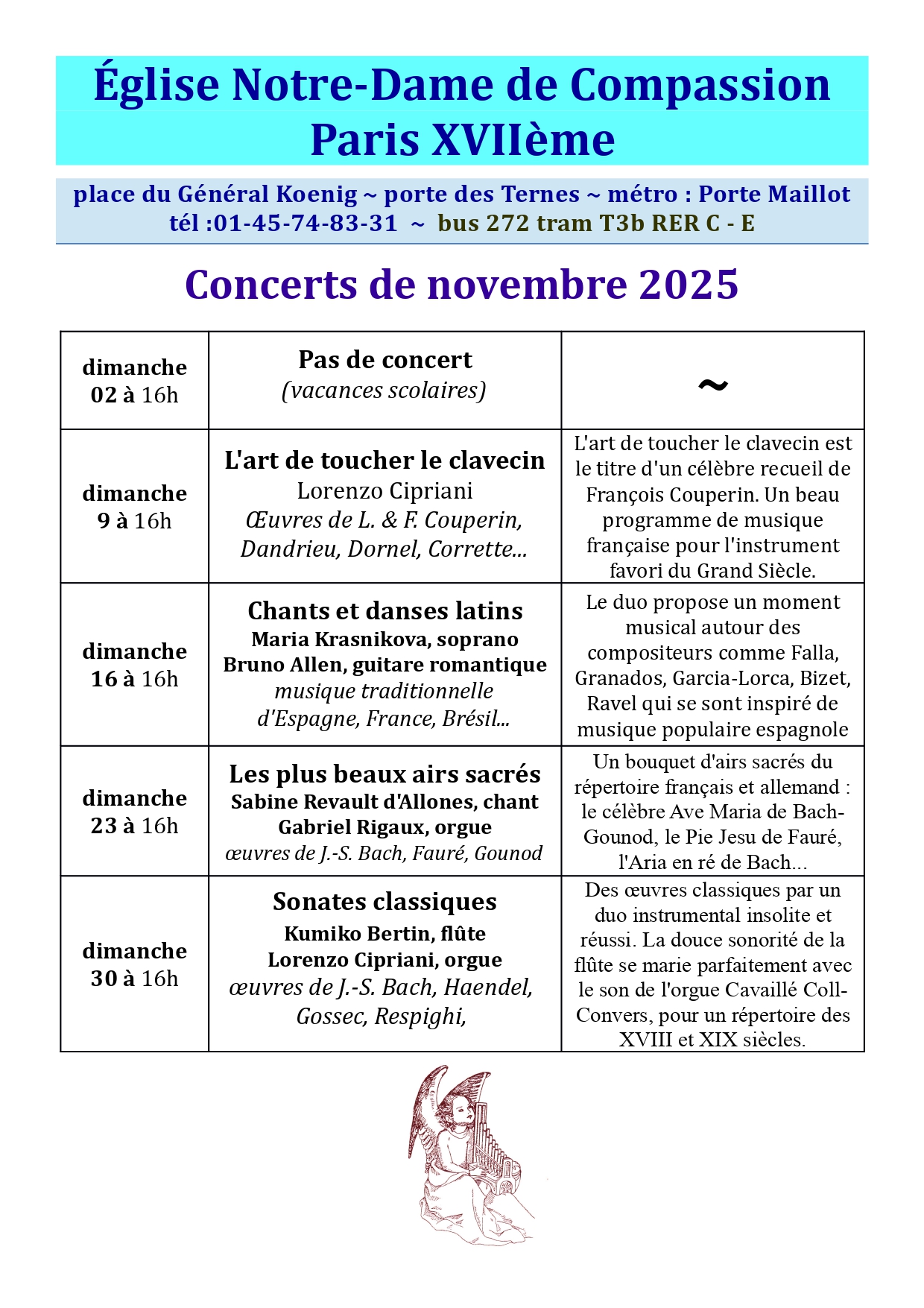 Des œuvres classiques par un duo instrumental insolite et réussi. La douce sonorité de la flûte se marie parfaitement avec le son de l'orgue Cavaillé Coll-Convers, pour un répertoire des XVIII et XIX siècles. Kumiko Bertin à la flûte et Lorenzo Cipriani à l'orgue vont interpréter des oeuvres de J.-S. Bach, Haendel, Gossec, Respighi (la magnifique Aria originale pour flûte et orgue). Dans la belle acoustique de l'église N.-D. de Compassion de Paris