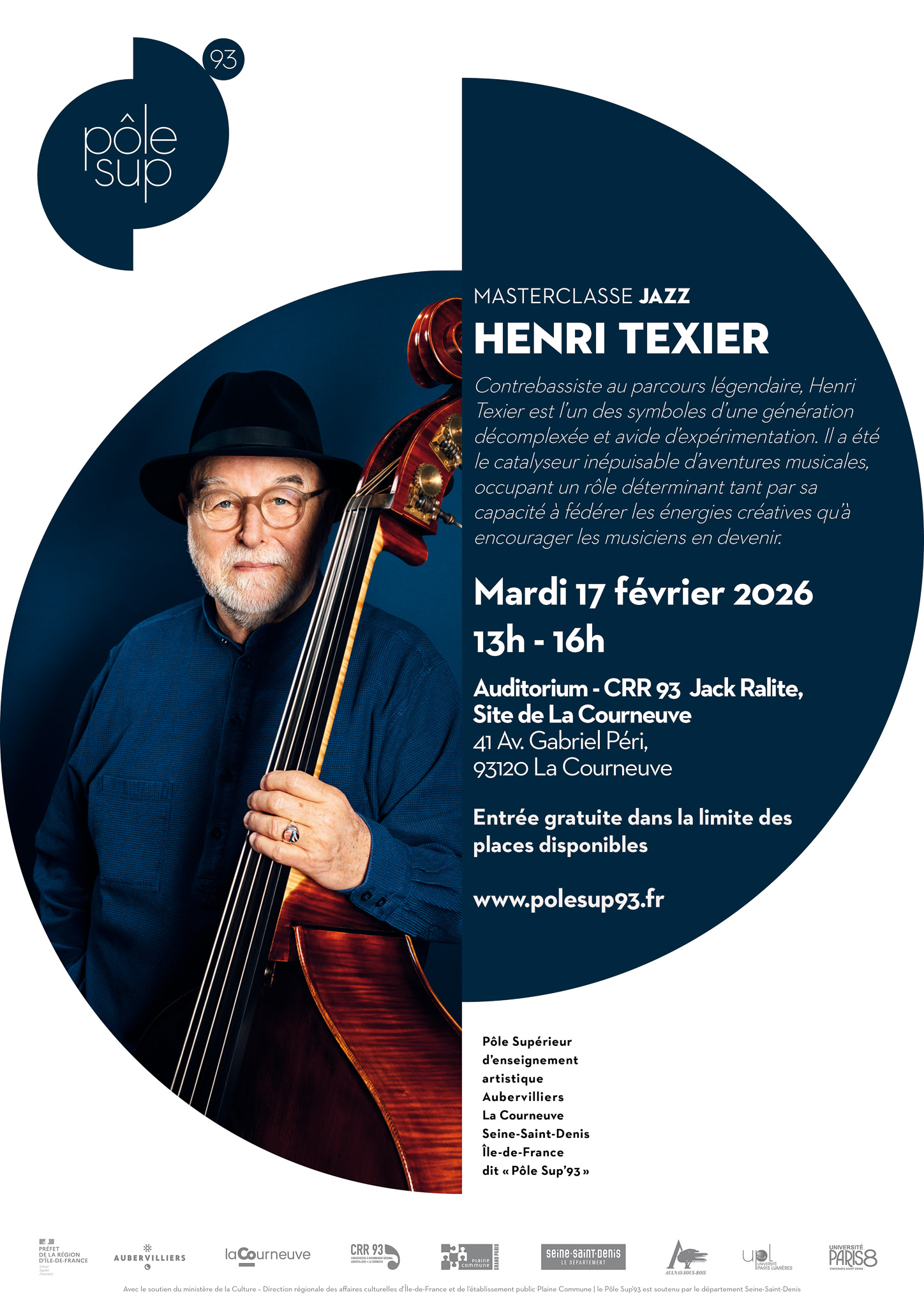Le Pôle Sup’93 a le plaisir d’accueillir Henri Texier, figure majeure et incontournable du jazz européen, pour une masterclasse exceptionnelle. Contrebassiste au parcours légendaire, Henri Texier est l’un des symboles d’une génération ouverte, inventive et avide d’expérimentation. Véritable catalyseur artistique, ayant marqué des décennies de création en fédérant les énergies et en soutenant les musicien·nes émergent·es, il partagera avec les étudiant·es du Pôle Sup’93 son expertise artistique et pédagogique. Mardi 17 février 2026, 13h → 16h Auditorium Erik Satie, CRR 93 Jack Ralite – site de La Courneuve Entrée gratuite dans la limite des places disponibles