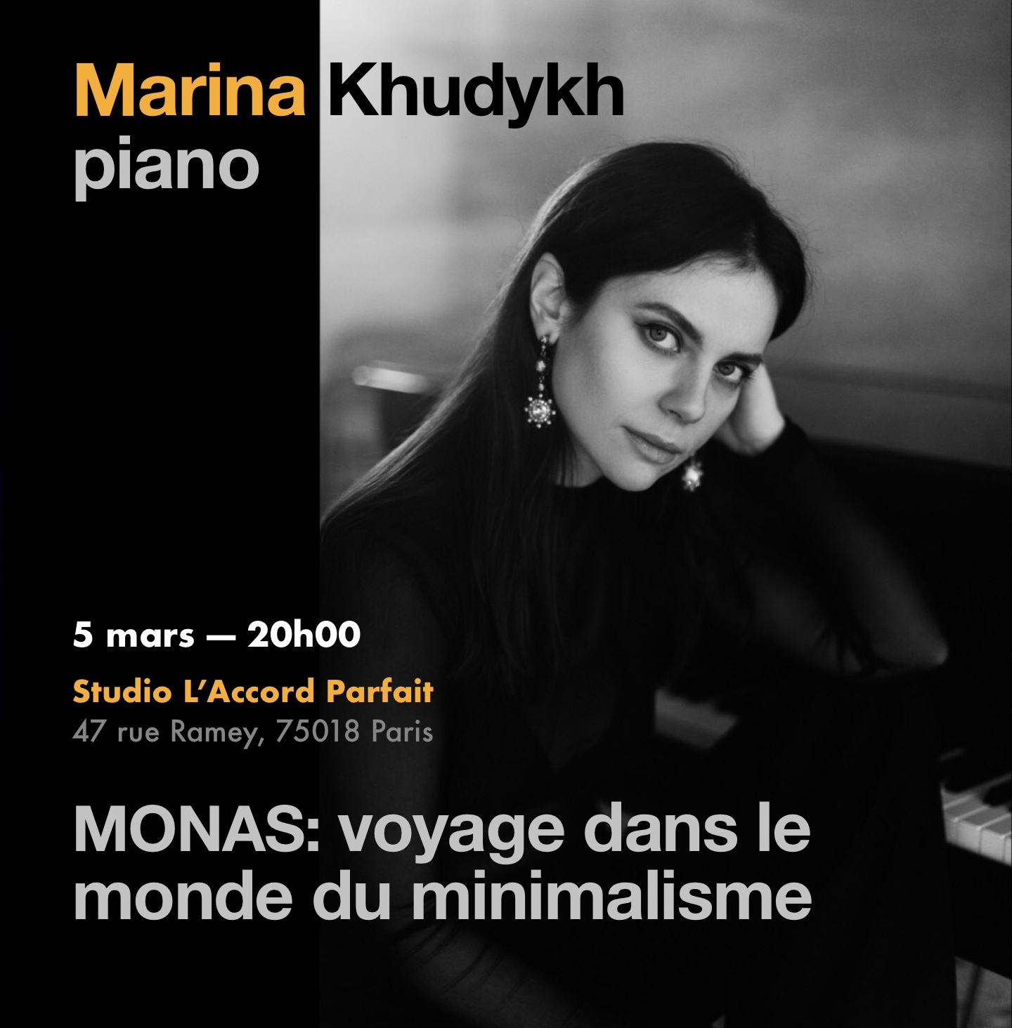 MONAS : un voyage dans l’univers du minimalisme 📅 5 mars à 20h00 🎟 Billets : 15 € 📍 Studio L’Accord Parfait, 47 Rue Ramey, 75018 Paris Musique pour piano solo de Arvo Pärt, John Adams, Philip Glass et Henryk Górecki. Monas n’est pas seulement un concert — c’est une immersion dans un flux méditatif de motifs sonores, caractéristiques du minimalisme et du minimalisme sacré. Les œuvres, réunies comme les pièces d’un même puzzle, vous transporteront dans un univers fantastique de couleurs acoustiques. Interprété par Marina Khudykh — pianiste, metteuse en scène de programmes de concert, lauréate de concours internationaux et intervenante TEDx.