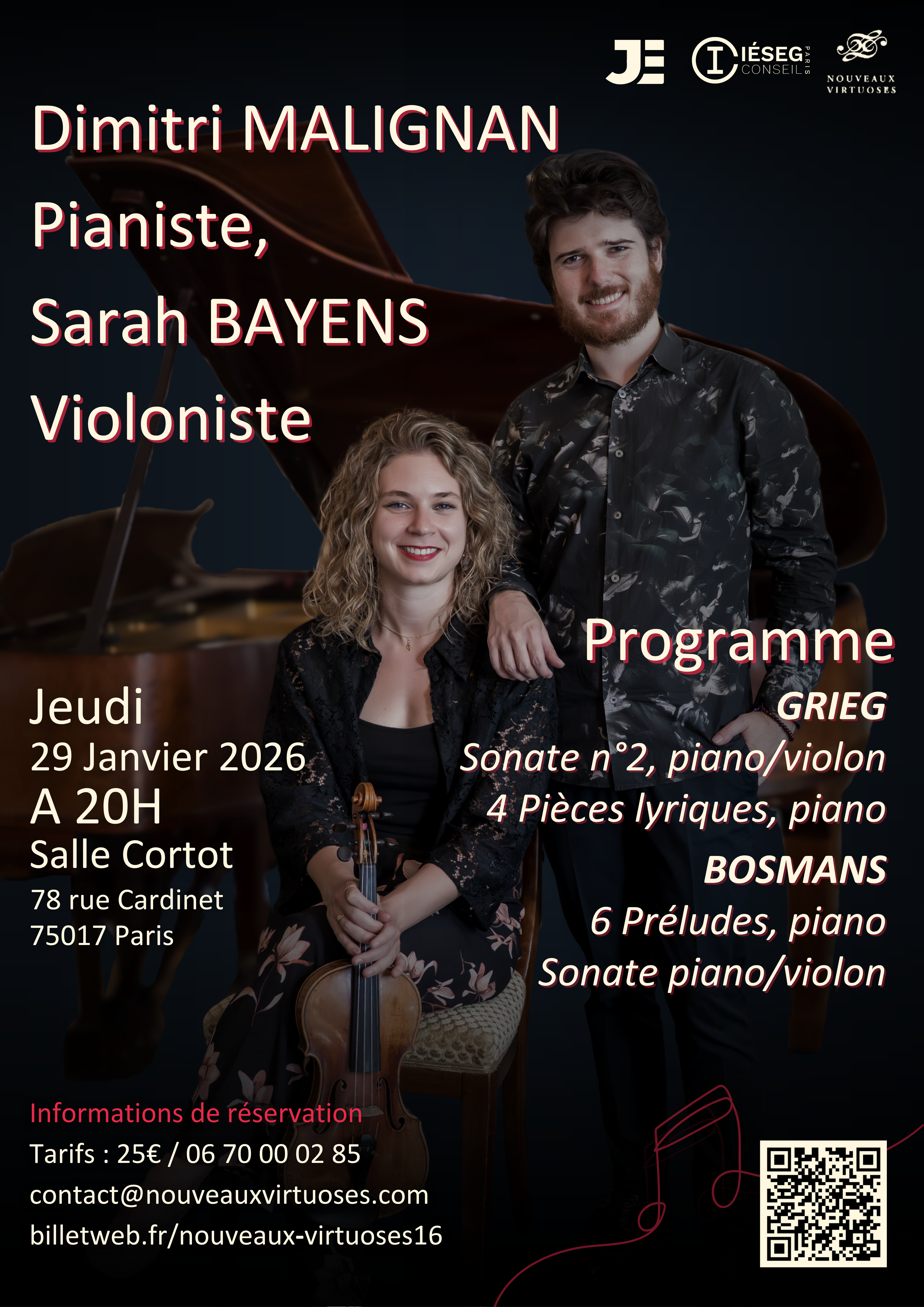 A l'occasion de la sortie de leur nouvel album dédié à Henriette Bosmans (le Diable dans la nuit, Editions Hortus), la violoniste belge Sarah BAYENS et le pianiste français Dimitri MALIGNAN mettent en miroir la grandiose Sonate pour violon et piano de la compositrice néerlandaise avec la pittoresque 2ème Sonate du compositeur norvégien Edvard Grieg, ami de la famille Bosmans. Deux grandes Sonates assurément romantiques, d'un compositeur alors dans la force de la maturité et fortement inspiré des richesses du folklore nordique et d'une jeune compositrice influencée par le post-romantisme européen. Des oeuvres pour piano seul des deux compositeurs complètent ce programme reflétant l'influence des fantasques Pièces lyriques de Grieg sur les Préludes de Bosmans.