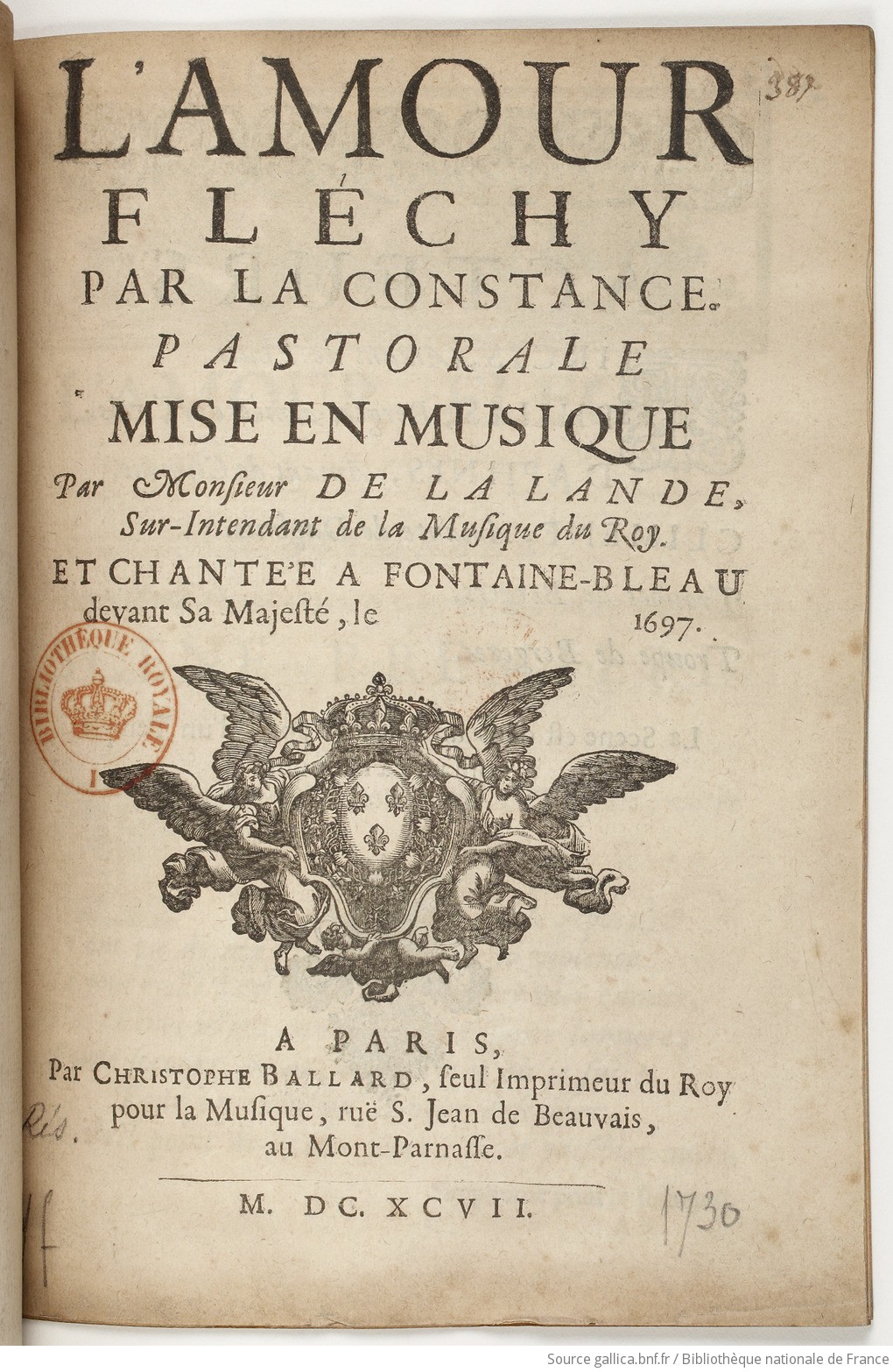 Le tricentenaire de la mort de Michel-Richard de Lalande (1657-1726), figure majeure de la musique à la cour de Louis XIV, offre au Centre de musique baroque de Versailles l’occasion d’imaginer un projet pédagogique ambitieux avec les départements de musique ancienne des CRR de Paris et de Versailles Grand Parc associés aux Chantres du CMBV, pour la recréation française de deux ouvrages lyriques inédits du compositeur. À cette occasion, le CMBV s’associe à plusieurs partenaires pédagogiques, notamment les départements de musique ancienne des CRR de Versailles et de Paris, pour la recréation française de deux ouvrages lyriques du compositeur : L'Amour fléchi par la constance, petite pastorale créée à Fontainebleau et reprise au Grand Trianon en 1697, et le prologue du Ballet de la Jeunesse, dansé à et par la Cour en 1686. De jeunes chanteurs solistes et instrumentistes, recrutés sur audition, rejoignent les Chantres du CMBV pour porter ce projet pédagogique inédit, encadrés par des spécialistes du répertoire baroque français et placés sous la direction de Fabien Armengaud, directeur artistique et musical de la Maîtrise du CMBV. Musique, chant, déclamation et théâtralité seront au cœur du travail, mis au service de partitions restaurées et éditées par le CMBV. Fabien Armengaud, direction musicale Julia Gros de Gasquet, mise en espace Nathalie Perrier, lumières Benoît Dratwicki, conseiller en stylistique et déclamation chantée Thomas Leconte, recherche et édition Manon Sekfali-Bonnier, Climène Louise de Ricolfis, Philis / Palès Colin Isoir, Tircis Martin Barigault, Daphnis Étudiants du CRR de Paris et d'autres établissements Orchestre des étudiants des départements de musique ancienne des CRR de Paris et Versailles Grand Parc Les Chantres du Centre de musique baroque de Versailles Coproduction Centre de musique baroque de Versailles | CRR de Paris – Ida Rubinstein | CRR de Versailles Grand Parc | Théâtre Montansier Partitions éditées par le Centre de musique baroque de Versailles