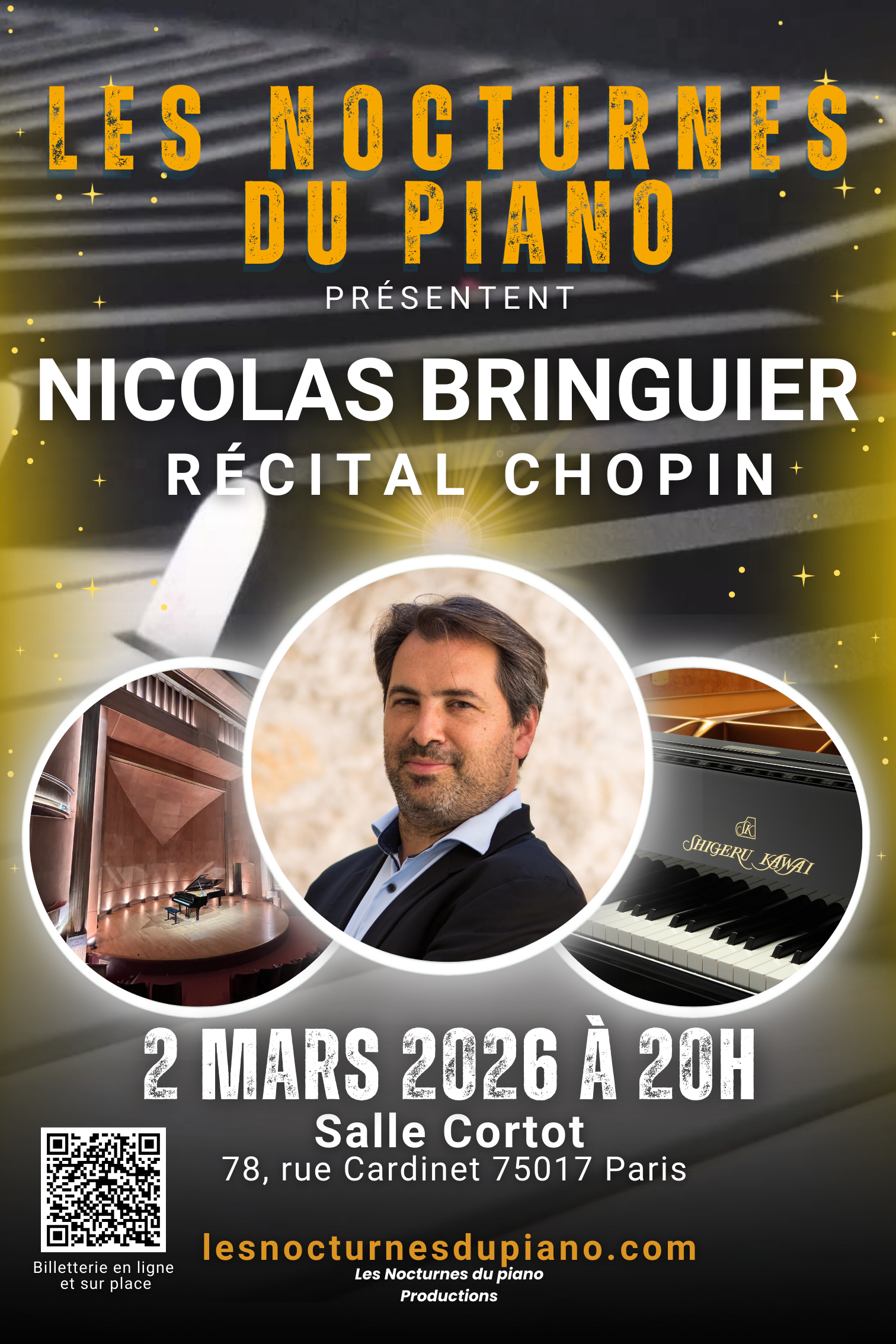 "Entre ombre et lumière" Une odyssée pianistique pour célébrer Chopin avec Nicolas Bringuier, Piano -------------------------------------------- A la salle Cortot (Paris), Nicolas Bringuier consacre ce récital à Frédéric Chopin à travers un programme ambitieux et contrasté, révélant toutes les facettes de son génie pianistique. De la narration fiévreuse de la Première Ballade à la gravité sombre de la Polonaise en ut mineur, le parcours s’ouvre sur un romantisme intense et dramatique. La Deuxième Sonate, avec sa célèbre Marche funèbre, déploie une architecture saisissante et visionnaire. Après l’entracte, les Nocturnes op. 62 offrent un moment de suspension et de pure poésie, avant l’élan monumental de la Troisième Sonate, sommet de maturité et de virtuosité. Professeur à l’École Normale de Musique et directeur artistique du Concours International de Piano Samson François, Nicolas Bringuier invite, par ce programme exigeant, à une immersion profonde dans l’univers de Chopin, entre introspection, passion et grandeur. Programme : Frédéric CHOPIN (1810-1949) -1ere Ballade op.23 -Polonaise en do mineur op.40/2 -2e Sonate op.35 -2 Nocturnes op.62 -3e Sonate op.58 Producteur : https://lesnocturnesdupiano.com/