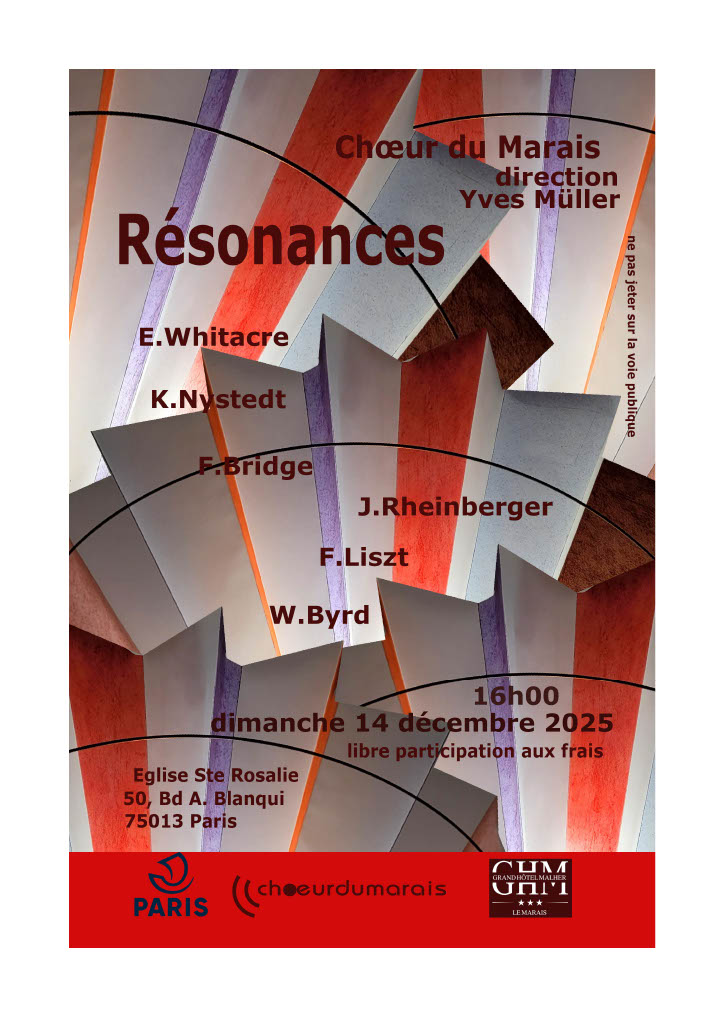 Madame, Monsieur, Je souhaiterais faire paraître une annonce pour un concert sur le site Internet de La Lettre du Musicien : Lieu : Eglise Sainte-Rosalie – 50 boulevard Auguste Blanqui 75013 Paris – métro Corvisart Programme : Oeuvres a capella de W. Byrd, F. Liszt, J. Rheinberger, F. Bridge, K. Nystedt, E. Whitacre Distribution : Choeur du Marais, direction : Yves Müller Tarifs : libre participation aux frais Je joins à ce formulaire l'affiche du concert, En vous remerciant à l'avance, Bien cordialement, Valérie LedardMadame, Monsieur, Je souhaiterais faire paraître une annonce pour un concert sur le site Internet de La Lettre du Musicien : Lieu : Eglise Sainte-Rosalie – 50 boulevard Auguste Blanqui 75013 Paris – métro Corvisart Programme : Oeuvres a capella de W. Byrd, F. Liszt, J. Rheinberger, F. Bridge, K. Nystedt, E. Whitacre Distribution : Choeur du Marais, direction : Yves Müller Tarifs : libre participation aux frais Je joins à ce formulaire l'affiche du concert, En vous remerciant à l'avance, Bien cordialement, Valérie Ledard