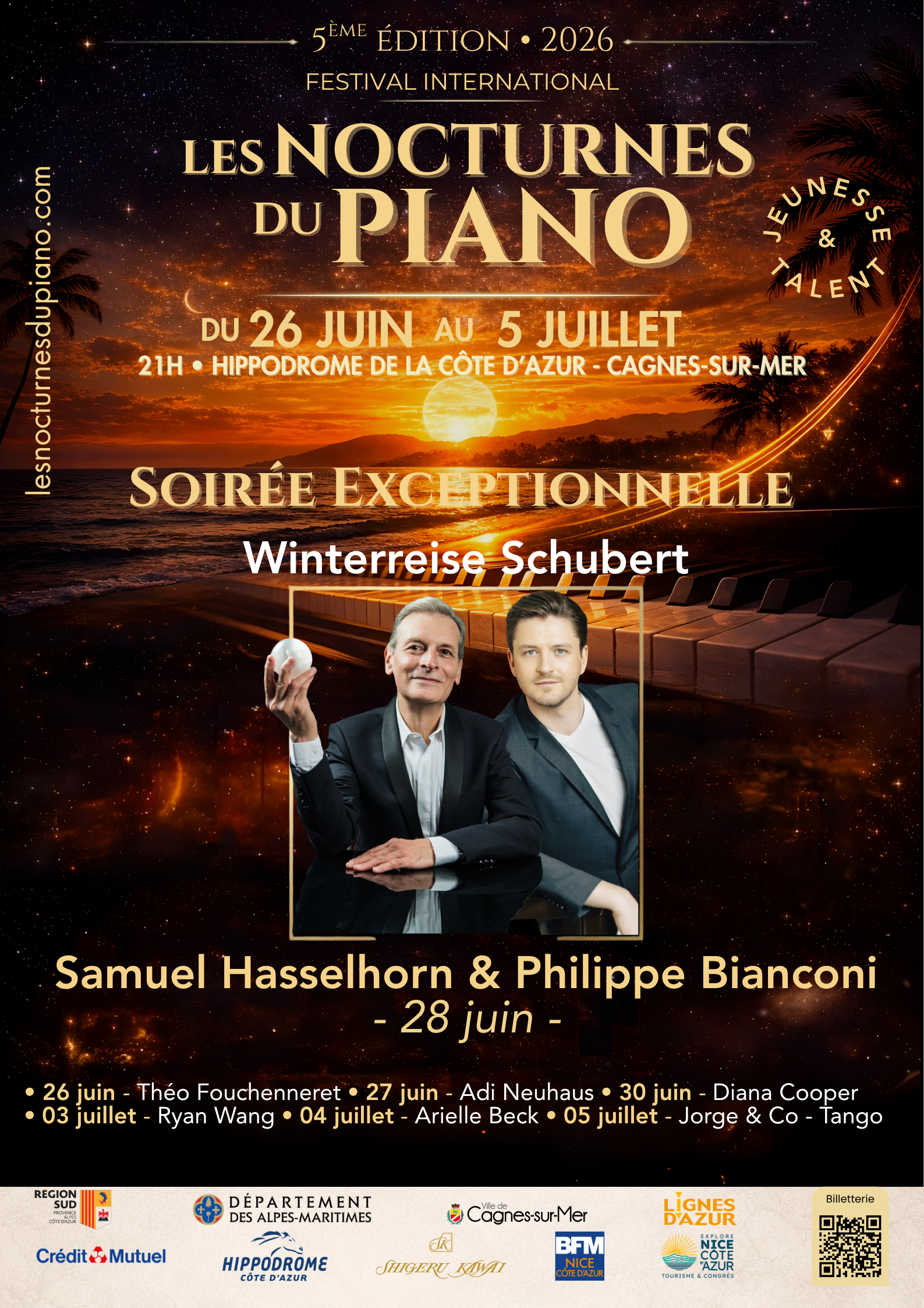 « Tant de choses ont été écrites ou dites sur le Voyage d'hiver, ce grand chef-d'œuvre de la musique classique ... Philippe Bianconi et Samuel Hasselhorn, grâce à leur incroyable talent et leur complicité sans faille, sauront réinventer pour nous cette œuvre magistrale. Ce 28 juin 2026 sera une soirée exceptionnelle et certainement, elle sera LA SOIRÉE de notre été. » — Christine Gastaud Une rencontre au sommet entre le Maître incontesté du piano français et international, et l'un des interprètes les plus recherchés pour le Lied allemand, 1er Prix du Concours Reine Elisabeth de Belgique en 2018. Programme : Le Voyage d'hiver - Schubert Programme en détail : https://lesnocturnesdupiano.com/recitals/ Billetterie en ligne : https://www.billetweb.fr/pro/lesnocturnesdupiano2026