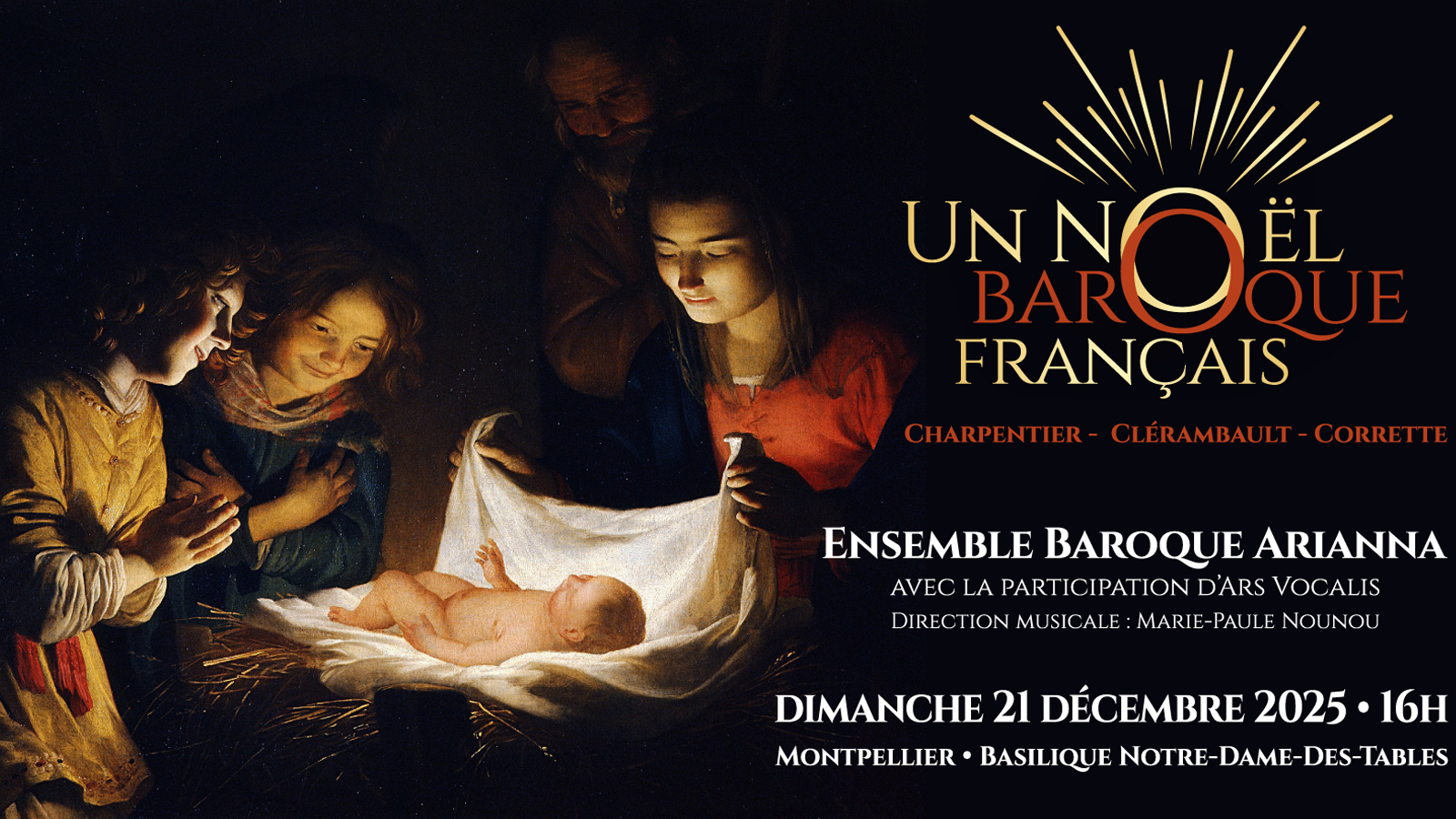 Concert de Noël Un noël baroque français Ensemble Arianna | solistes, chœurs et ensemble instrumental Direction musicale | Marie-Paule Nounou Avec la participation d’Ars Vocalis – Pôle d’art vocal de l’Ensemble Arianna. Le temps de la Nativité, avec celui de Pâques, occupe une place capitale dans la musique sacrée. Mais la particularité de Noël tient en ce que tout un répertoire de chants populaires est demeuré vivace à travers les siècles et a pénétré à divers degrés la musique savante, à commencer par la littérature pour orgue. Charpentier, qui est certainement le compositeur qui a le plus utilisé le thème de Noël, ainsi que Corrette illustrèrent cette matière dans leurs musiques de Noël. Ce faisant, ils poursuivaient une pratique courante. En mêlant intimement l’art du petit motet français, illustrés par Bernier et Clérambault, et musiques baroques pour le temps de Noël, nous souhaitons partager avec le public un moment propice au recueillement et à la ferveur, pour cette période si importante de l’année liturgique. A cet effet, il ne faudra pas manquer le poignant Miserere de Clérambault pour les seules voix de femmes. C'est dans la très belle Basilique Notre-Dame-Des-Tables de Montpellier, que l'Ensemble Arianna proposera ces magnifiques joyaux, avec la participation de Cécile Larroche et Lucile Magnan, dessus, Bertrand Dazin, haute-contre, Raphaël Bremard, taille, et Olivier Déjean, basse-taille, spécialistes de ce grand répertoire, sous la direction de Marie-Paule Nounou. Un concert prestigieux qui enchantera les amateurs de musique vocale baroque. Nul doute que le public répondra présent pour ce concert qui réservera de belles surprises à tout mélomane curieux.